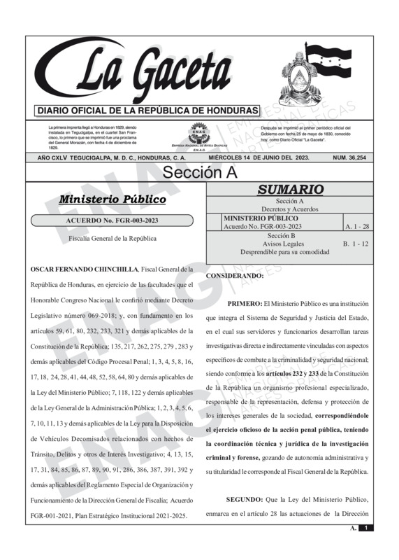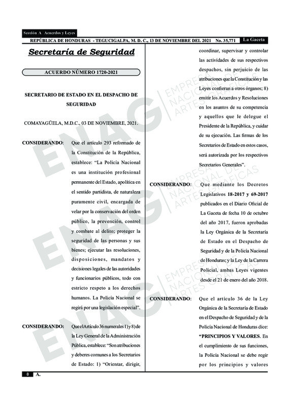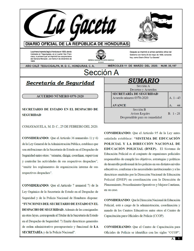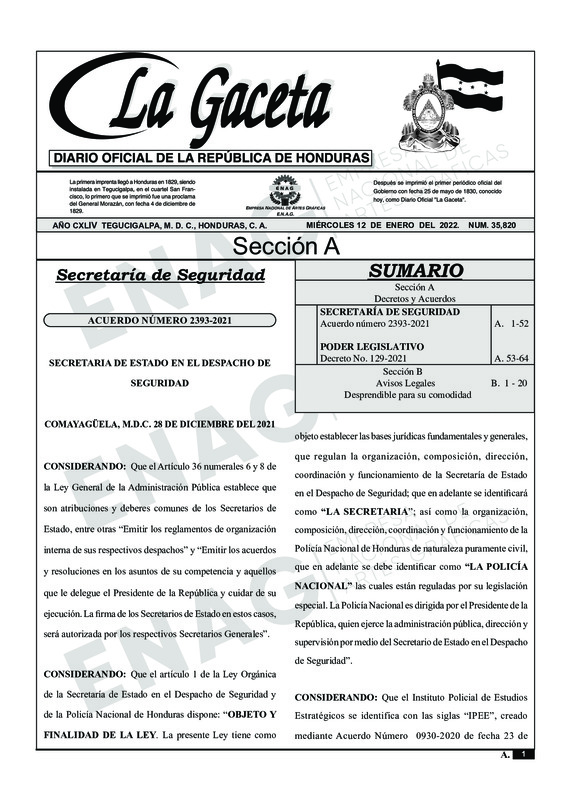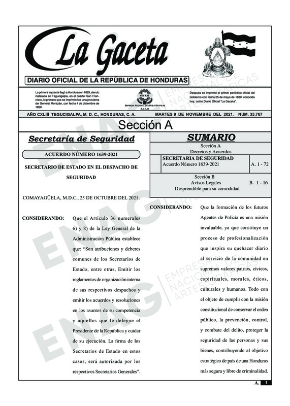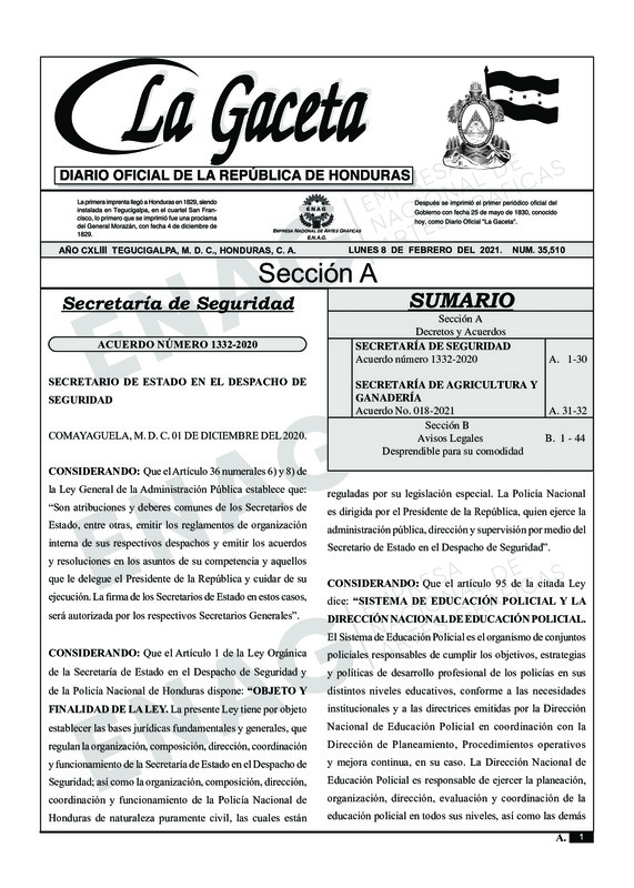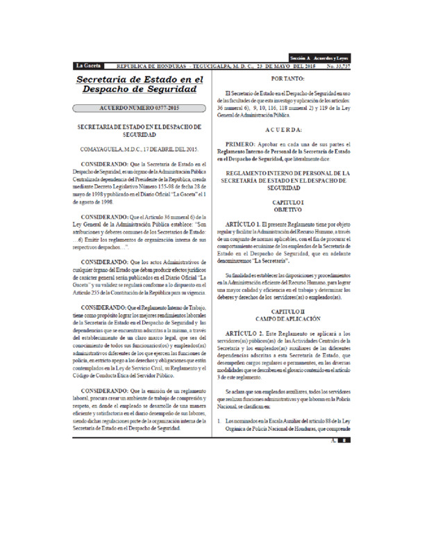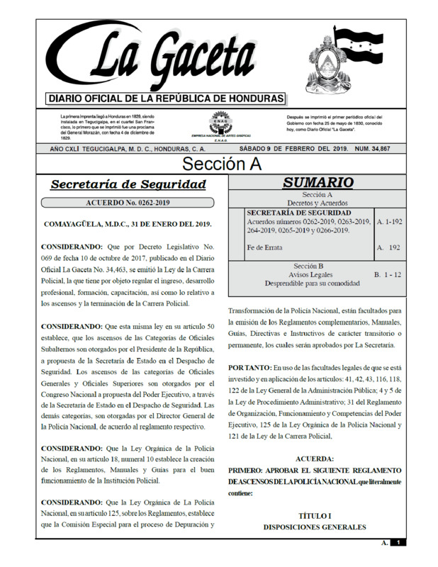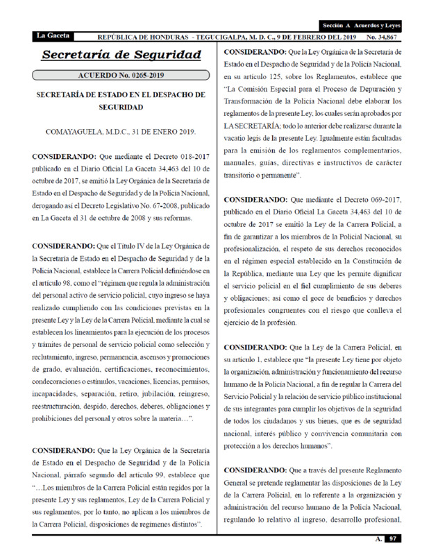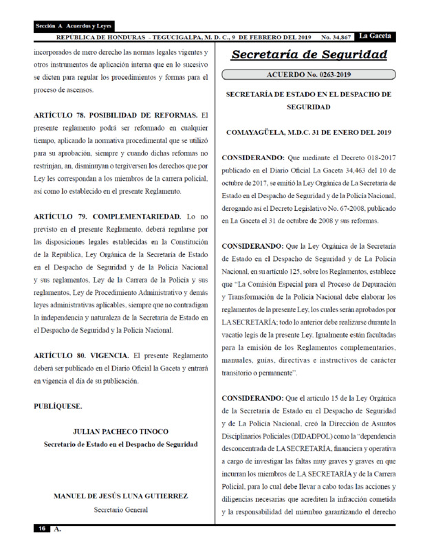Reglamento disciplinario aplicable al personal de Secretaria de Seguridad y Policía Nacional. Acuerdo 0263-2019