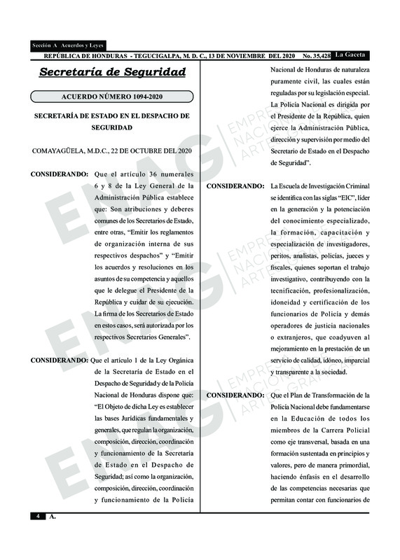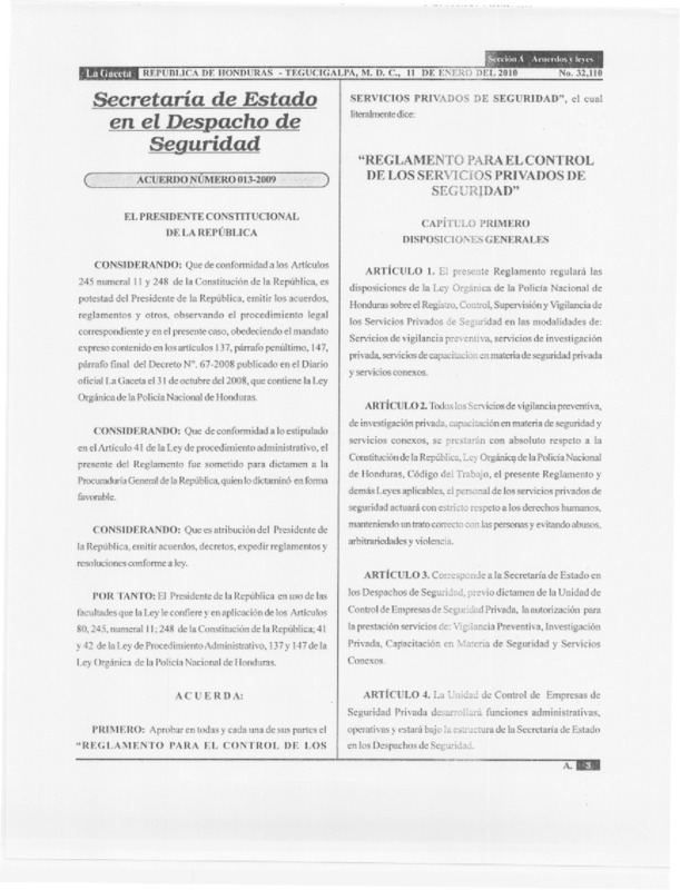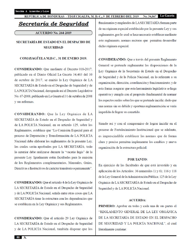 Reglamento General de la Ley Orgánica de la Secretaria de Seguridad y PolicÍa Nacional. Acuerdo No. 264-2019