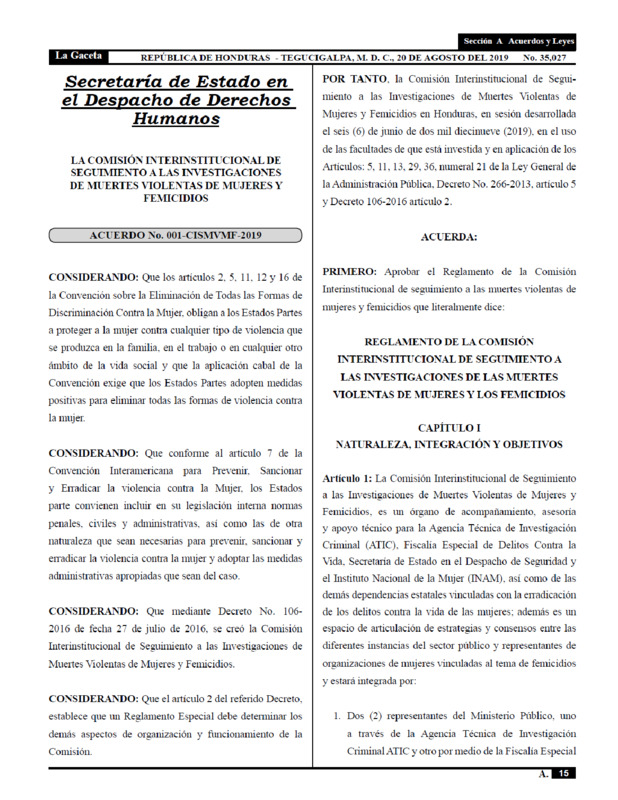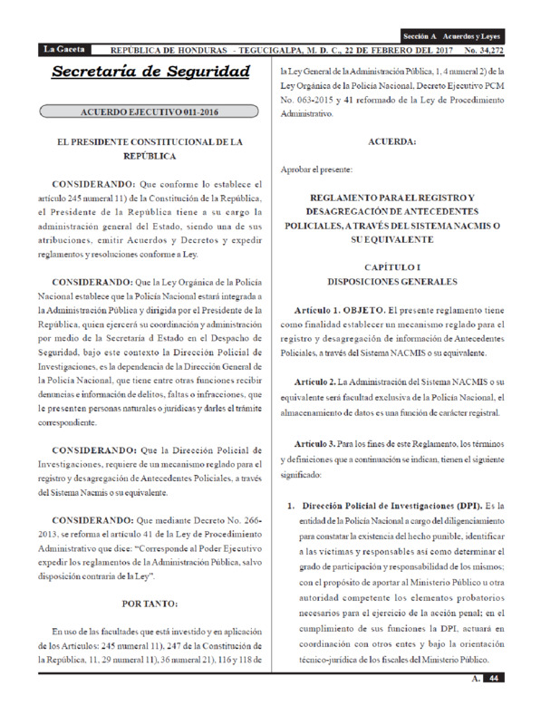 Reglamento para el registro y desagregación de antecedentes policiales a través de Sistema NACMIS o su equivalente. Acuerdo ejecutivo 011-2016