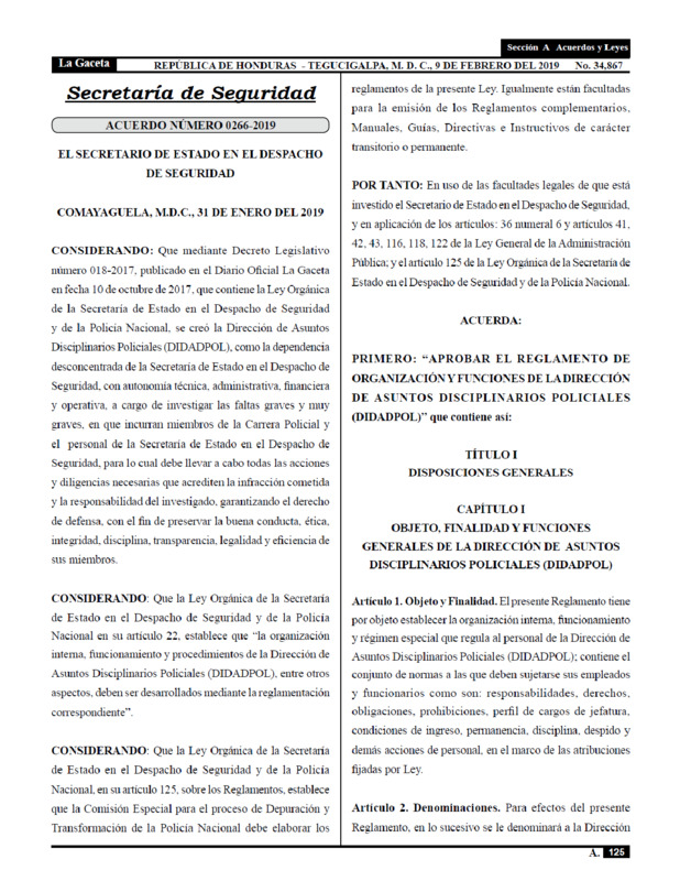 Reglamento de organización y funciones de la Dirección de Asuntos Disciplinarios Policiales DIDADPOL. Acuerdo 0266-2019